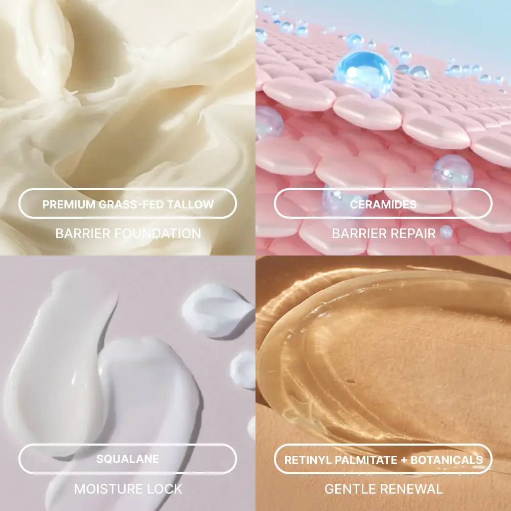 I learned tallow is almost identical to the oils your skin naturally produces. So instead of just slapping moisture on top (which is what most moisturizers do), this one actually repairs your skin barrier so it can hold onto hydration again.